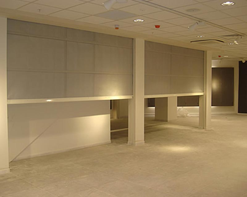 Flameshield fire curtains are made with fire rated fabric and woven with Kevlar and stainless steel thread to provide protection equivalent to fire shutters. The lightweight curtains are only 0.65mm thick and retract into a compact cassette when not in use.